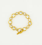 The Geneva Bracelet is a radiant, high-shine piece designed for those who adore classic glamour with a modern twist. Its bezel-set crystals glimmer beautifully around the wrist, while the gold-plated finish adds warmth and sophistication. The elegant toggle closure provides both ease and a chic finishing touch.