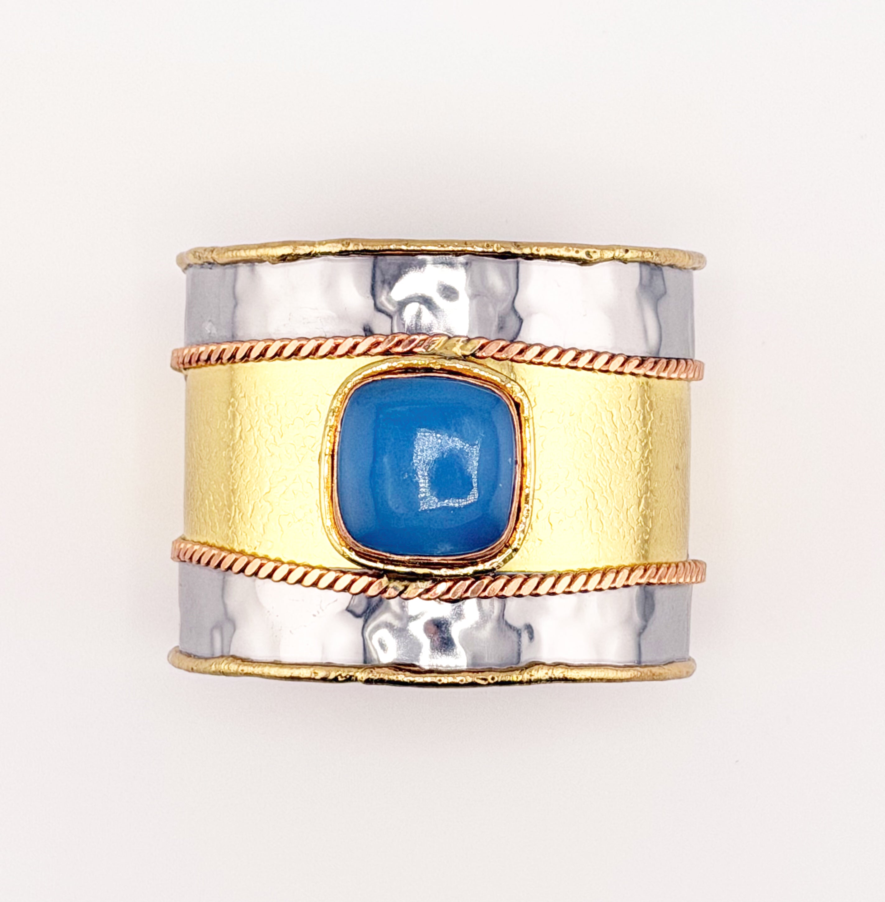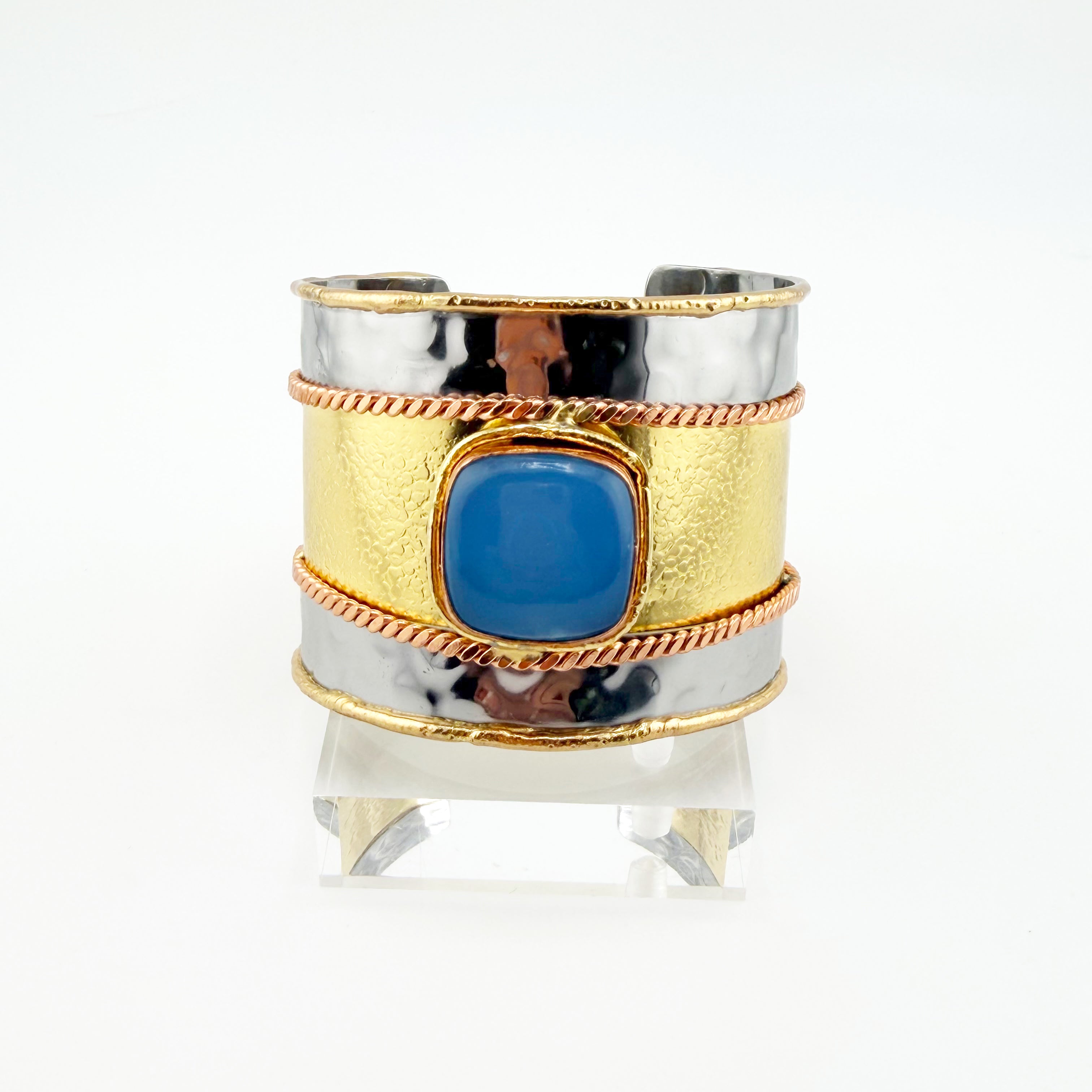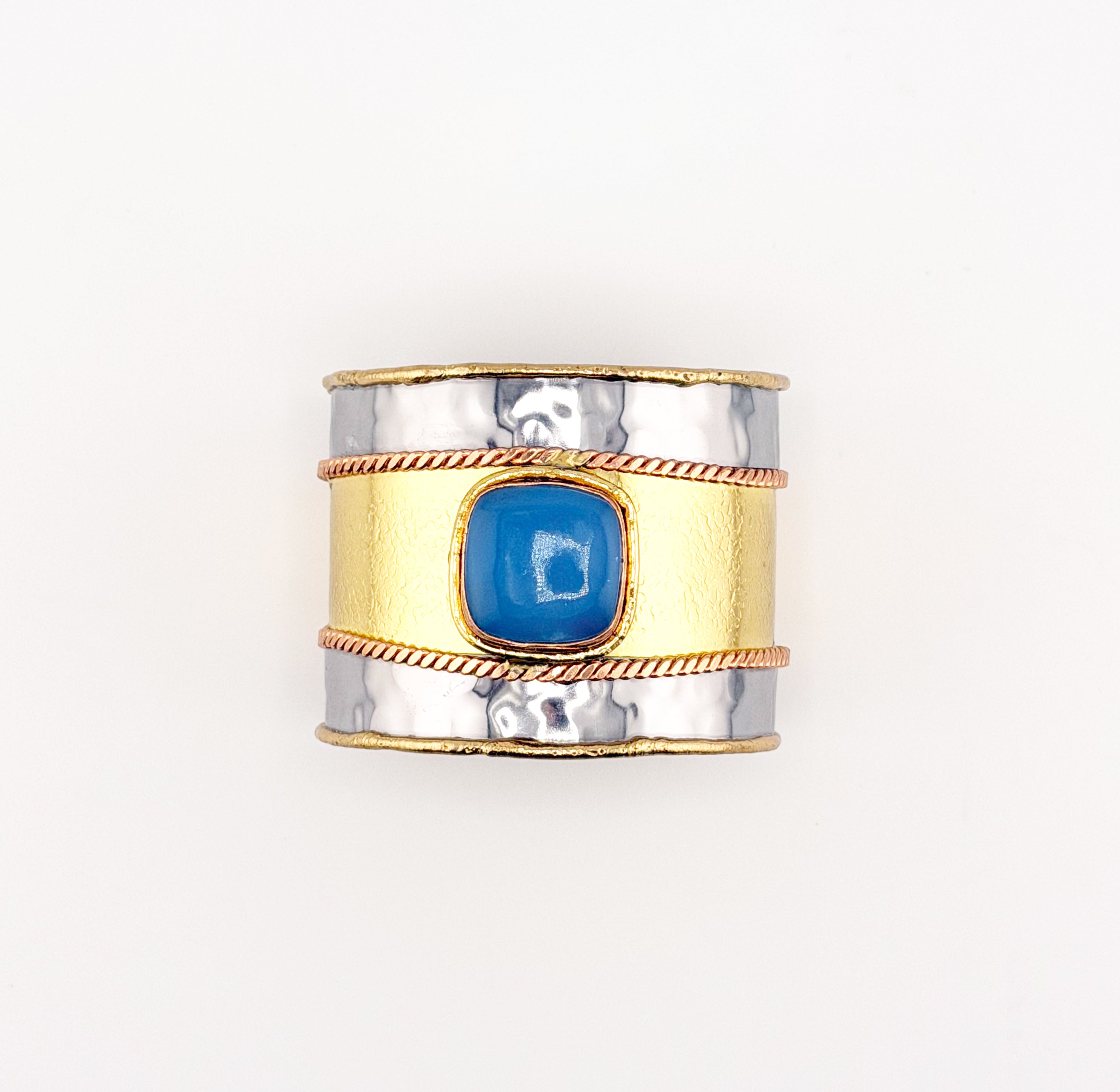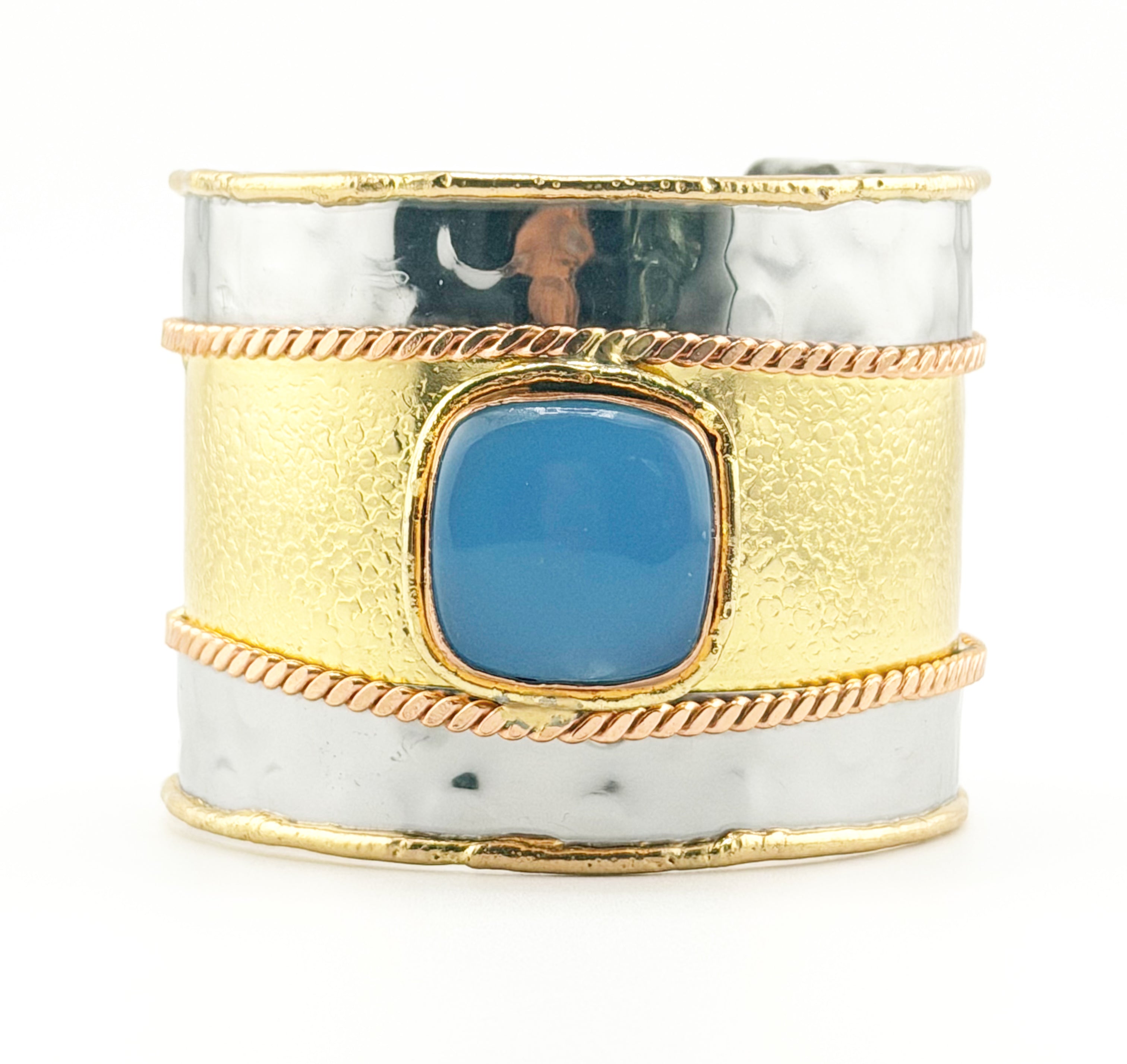 Bold, artisan-crafted, and impossible to ignore, The Santorini Sky Cuff is a hand-soldered statement piece designed to anchor your entire look. Hammered mixed metals in silver, gold, and copper create rich texture and contrast, while a luminous sky blue stone takes center stage.