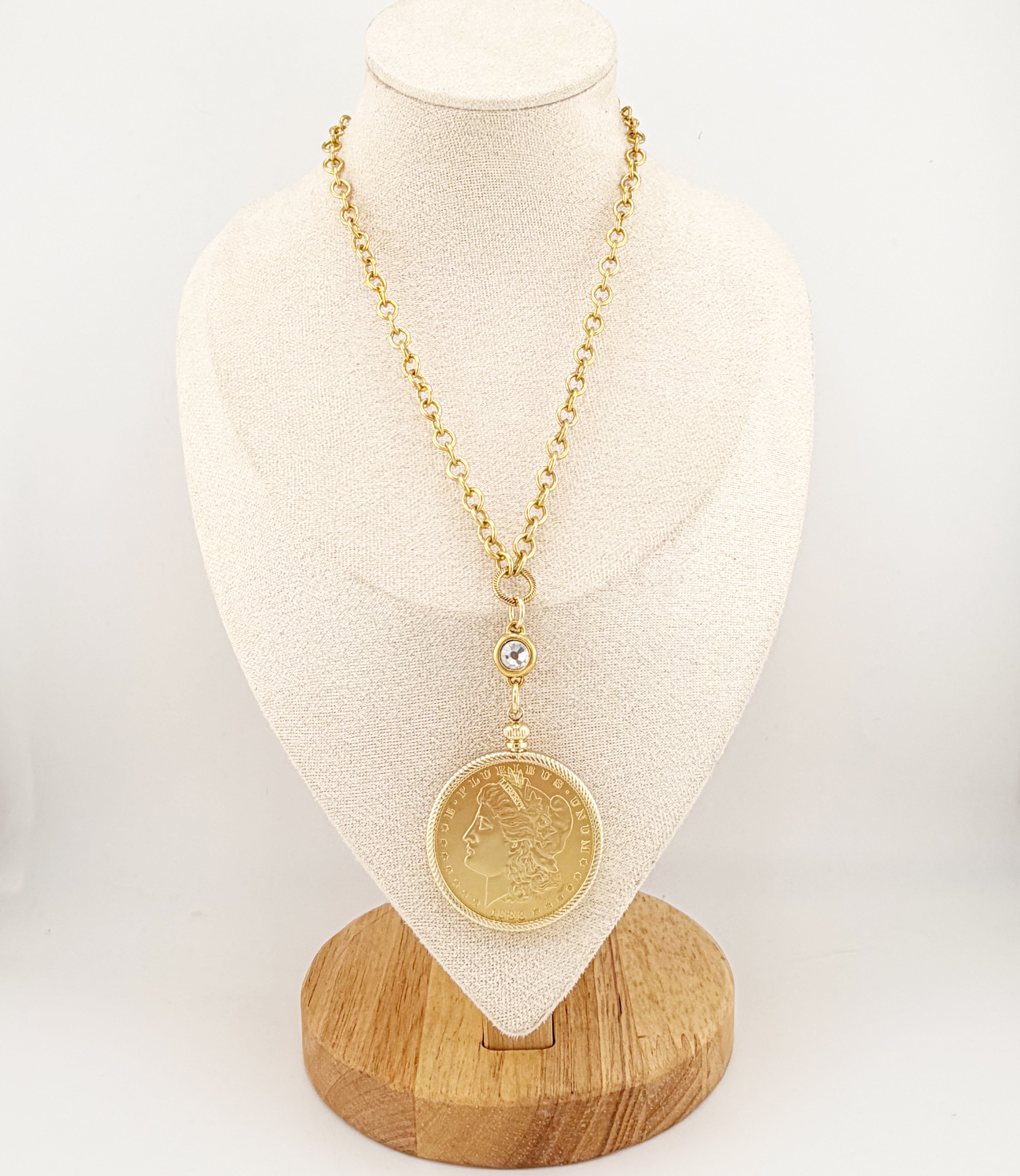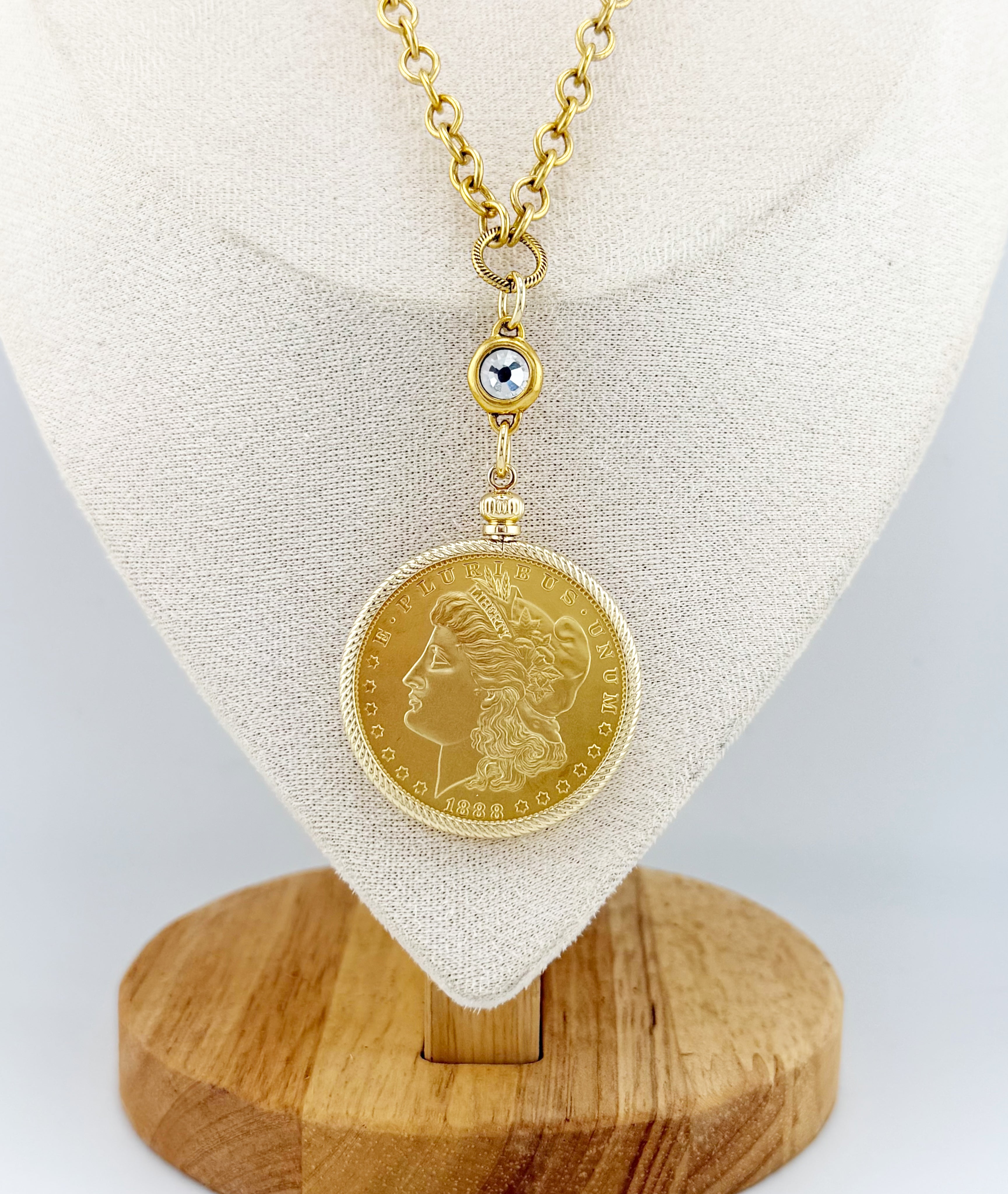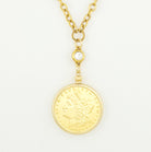 Timeless symbolism meets polished elegance in the Aurelia Liberty Coin Necklace. Featuring an E Pluribus Unum Lady Liberty coin set in a gold-on-gold bezel, this necklace is elevated with a single CZ accent that adds subtle sparkle. Classic yet refined, it’s a statement piece designed to feel meaningful, wearable, and endlessly stylish.