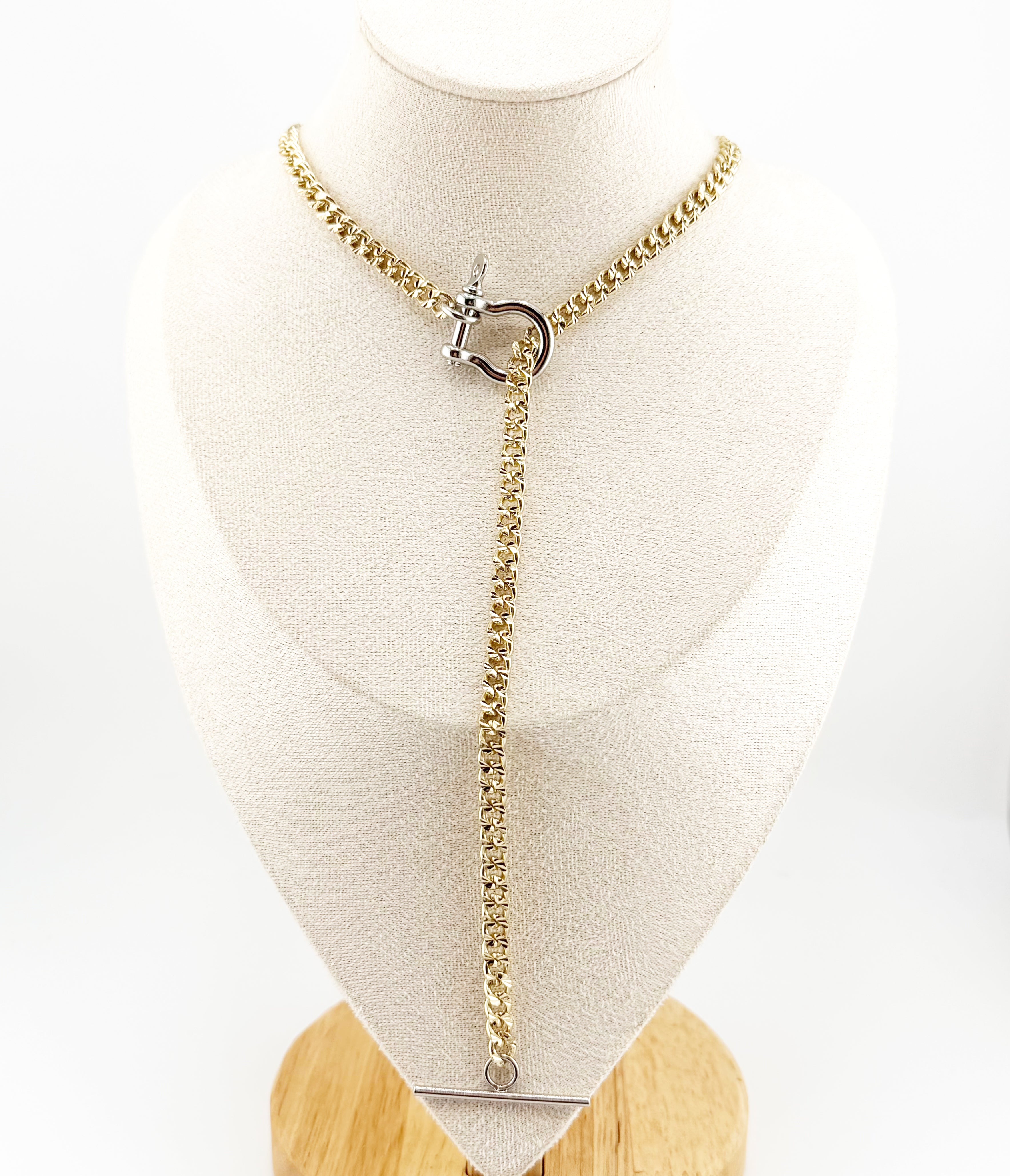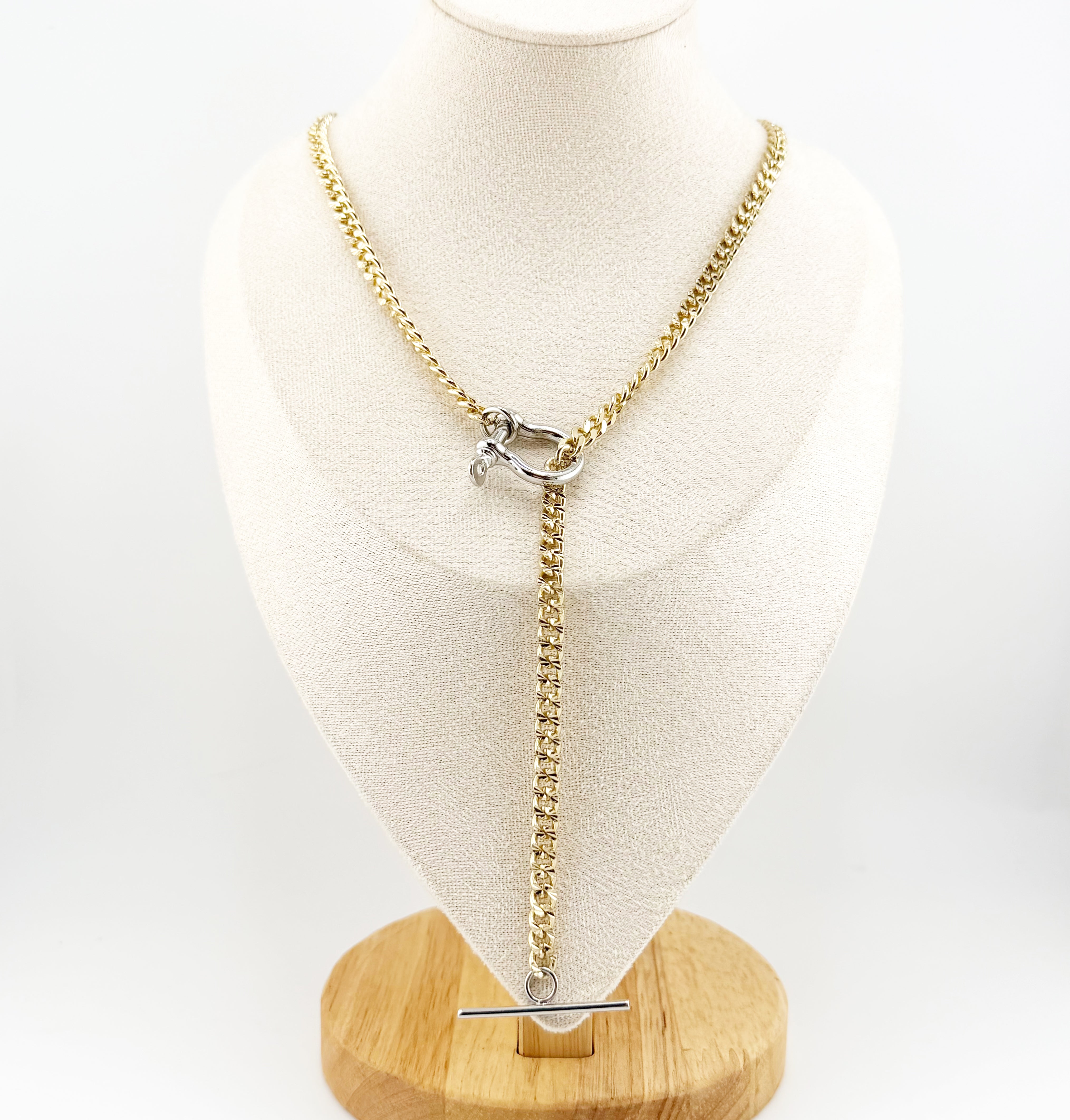 Classic equestrian influence meets modern versatility in The Derby Stirrup Lariat. Designed with a bold gold chain and finished with a signature stirrup-inspired toggle closure, this piece delivers effortless sophistication with a touch of sport-luxe edge.
