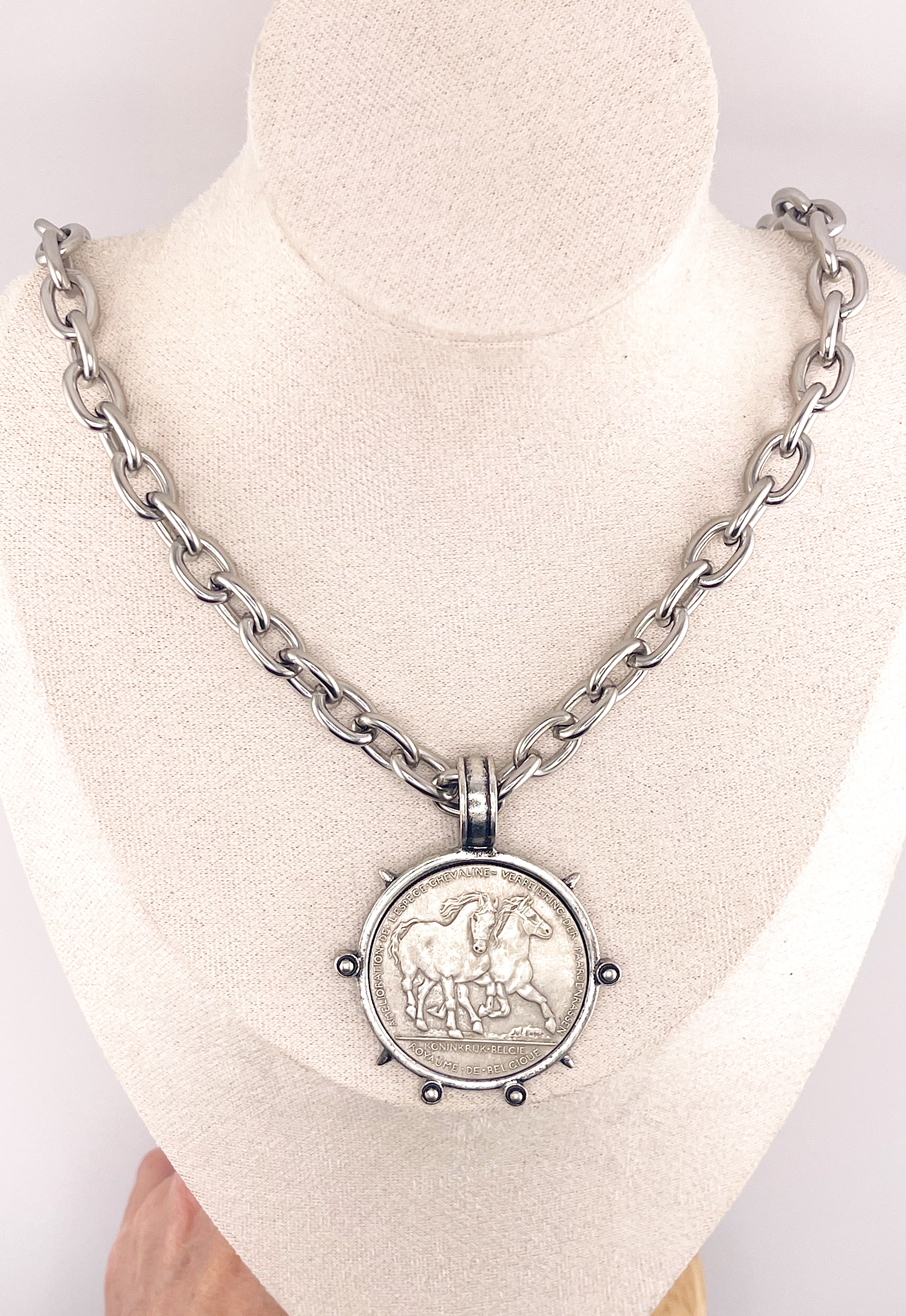 The Equestrian Coin Necklace – 26" Stainless Steel Chain with 1906 Hainaut Horse Medallion Pendant