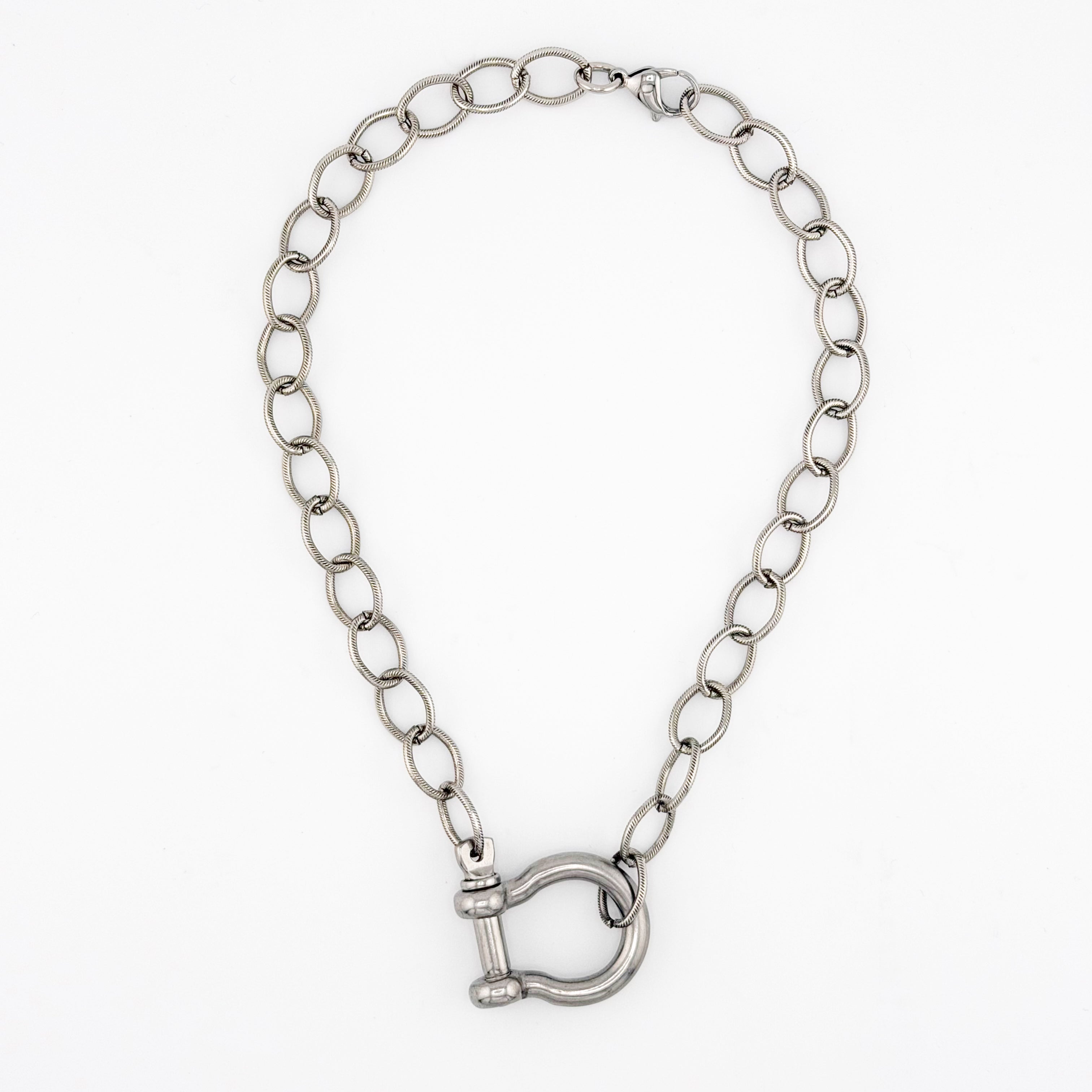 - Stainless steel link chain with statement front clasp detail.