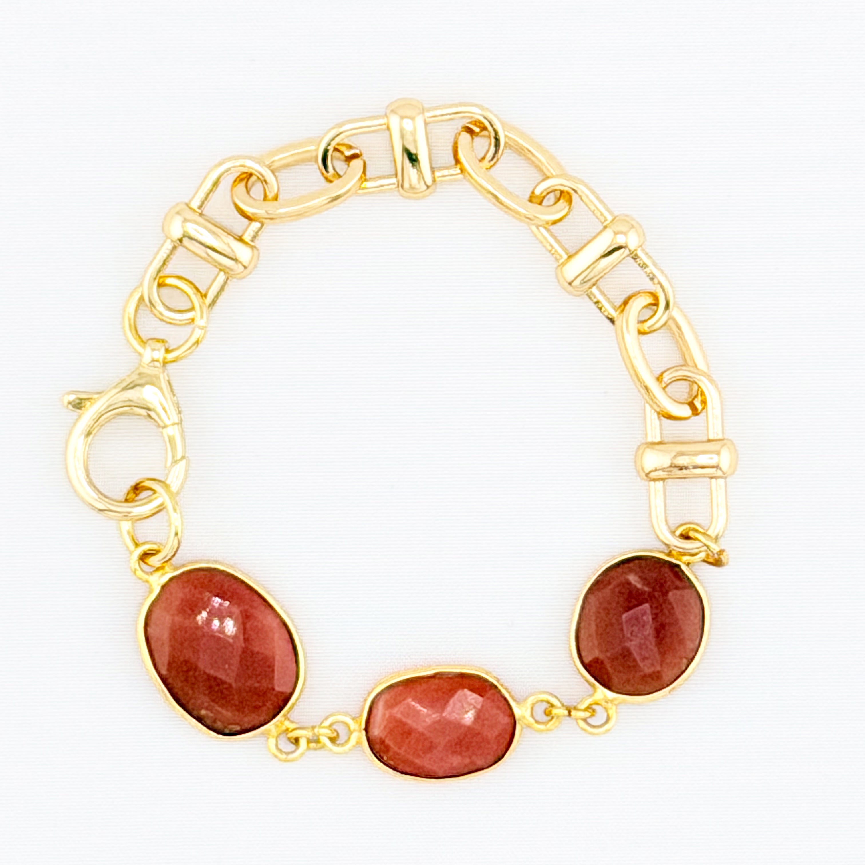 The Ember Link Bracelet combines the bold presence of a gold-plated chain with the earthy richness of moonstone gemstones in a peachy-pink tone. Whether worn alone or stacked, this bracelet adds a warm, polished finish to any outfit.