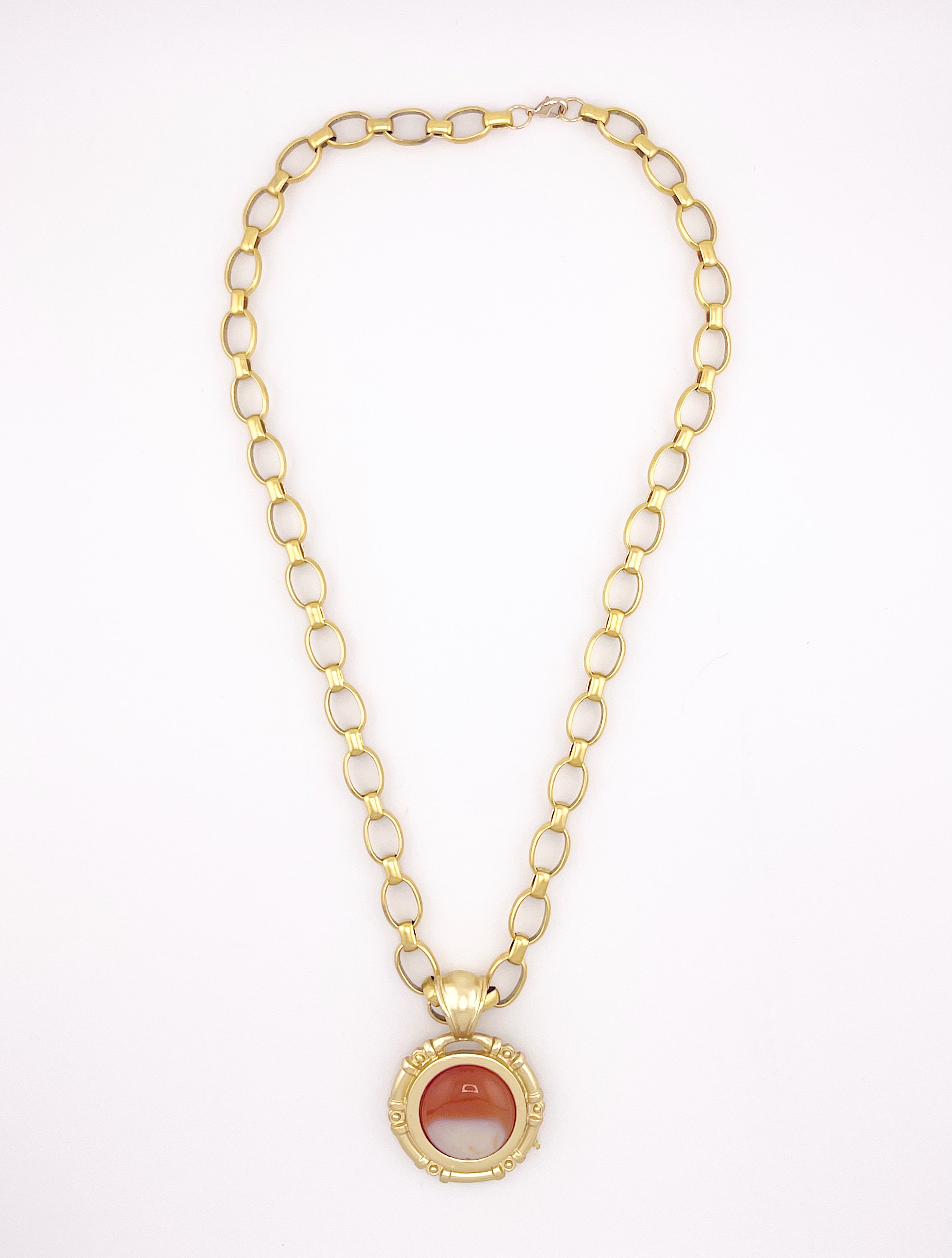 - Pendant: Red banded agate stone set in a gold bezel pendant.