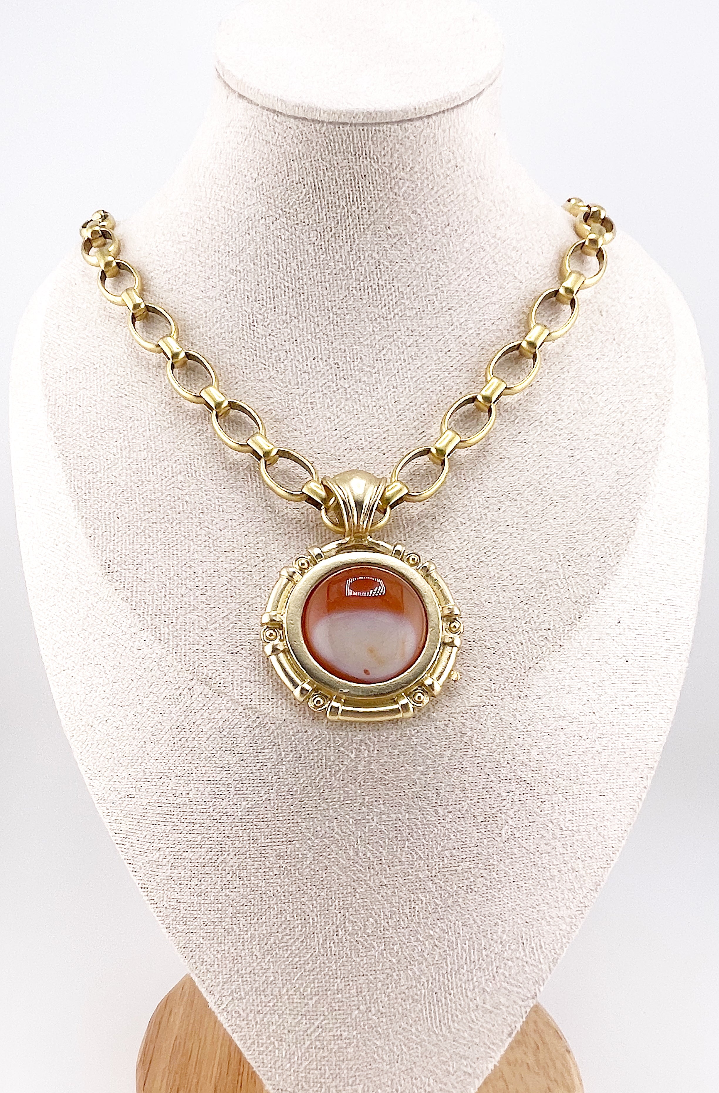 Perfect for both day and evening wear, The Verona Agate Necklace pairs beautifully with neutrals, black, or jewel tones. Its rich, natural hues and lustrous gold finish make it equally at home with a crisp blouse or a flowing dress — a true signature piece for any collection.