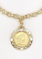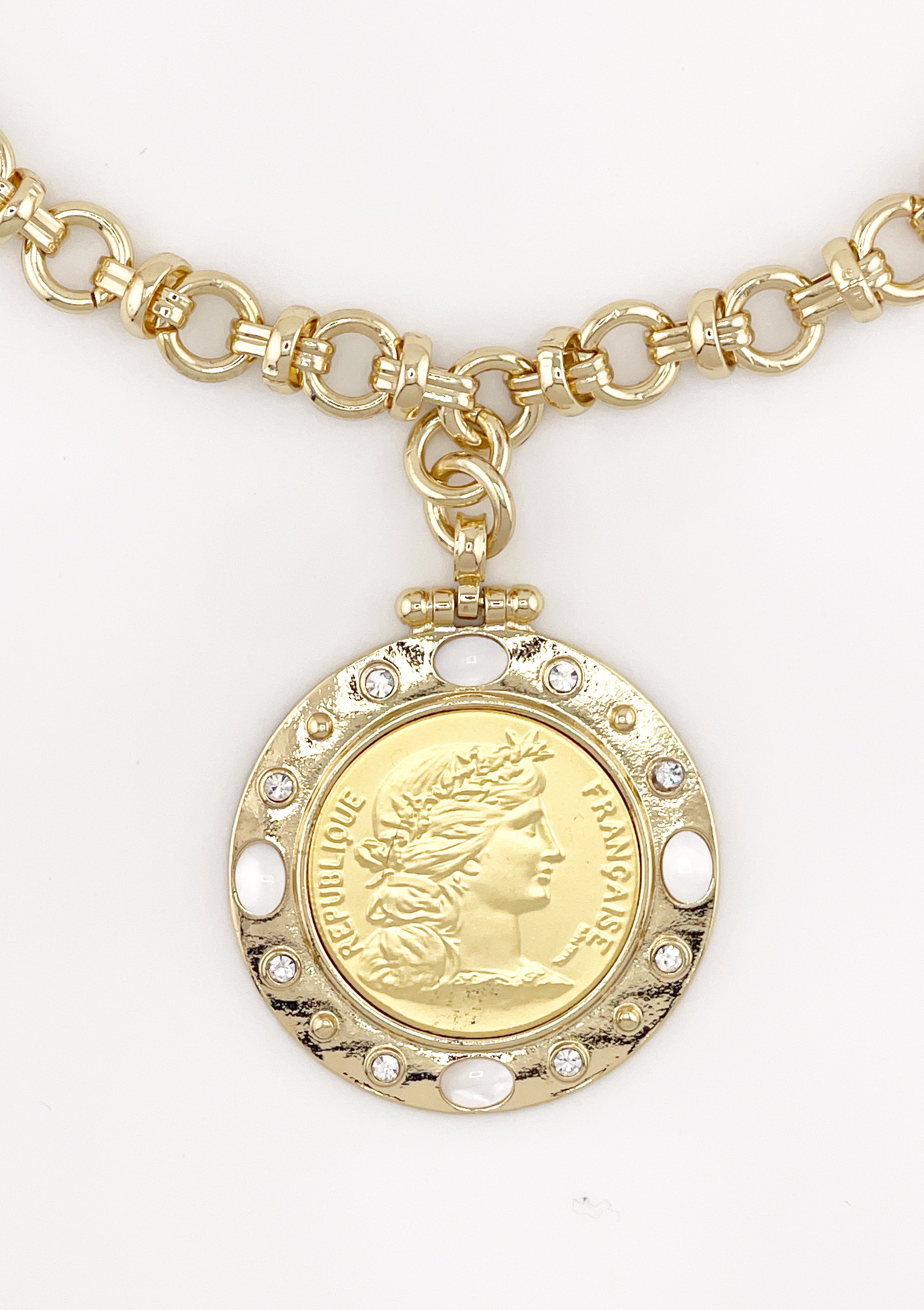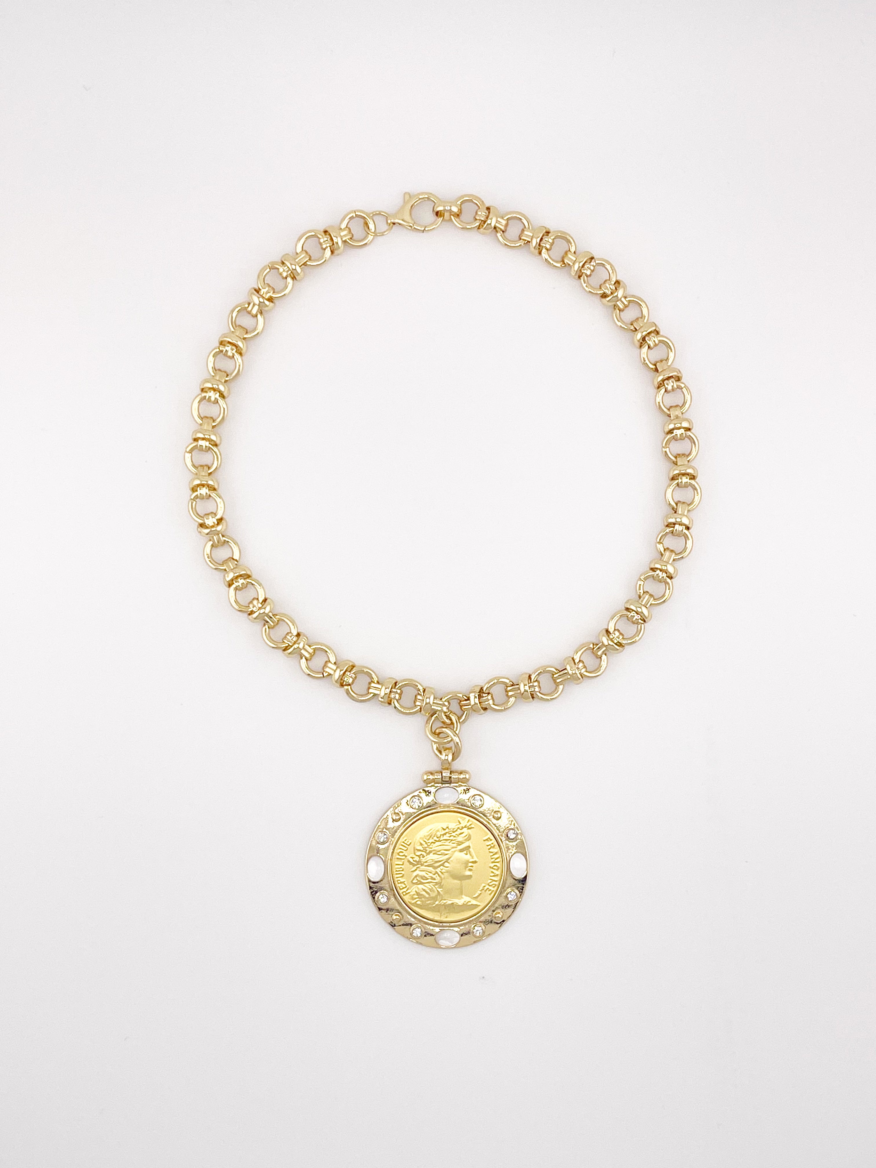 Timeless elegance meets French-inspired artistry in The Marseille Necklace. Featuring a gleaming Republique Française replica coin framed with luminous mother-of-pearl inlays and sparkling CZ accents, this necklace exudes sophistication and heritage charm. Its bold, polished chain adds a touch of modern glamour to this classic silhouette — perfect for the woman who appreciates statement pieces with story and style.