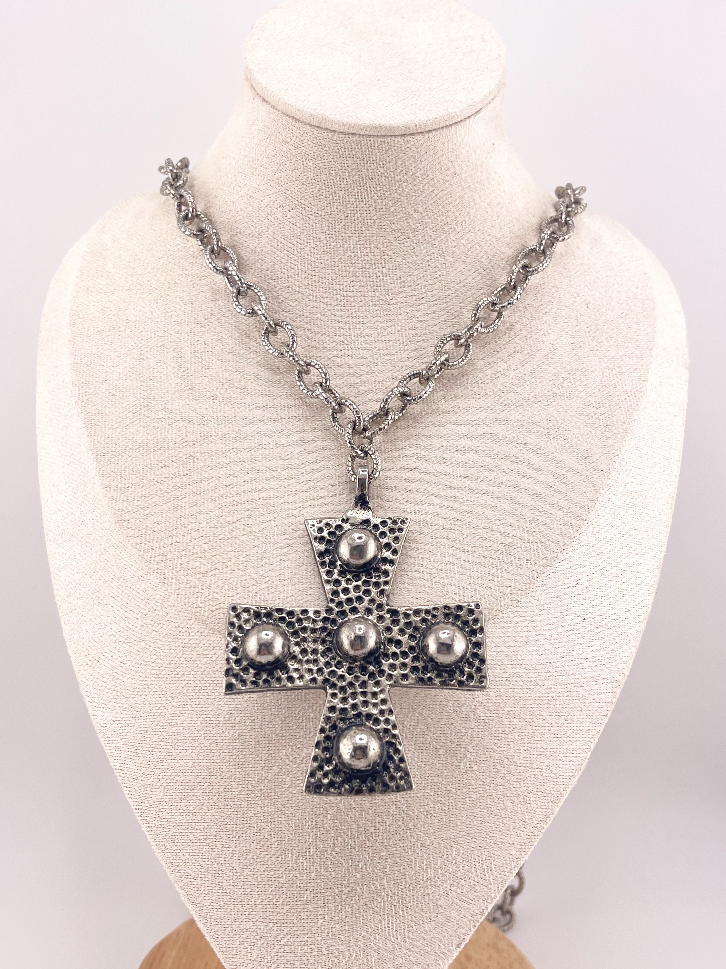 • Pendant: 3" antiqued silver cross with domed detailing.