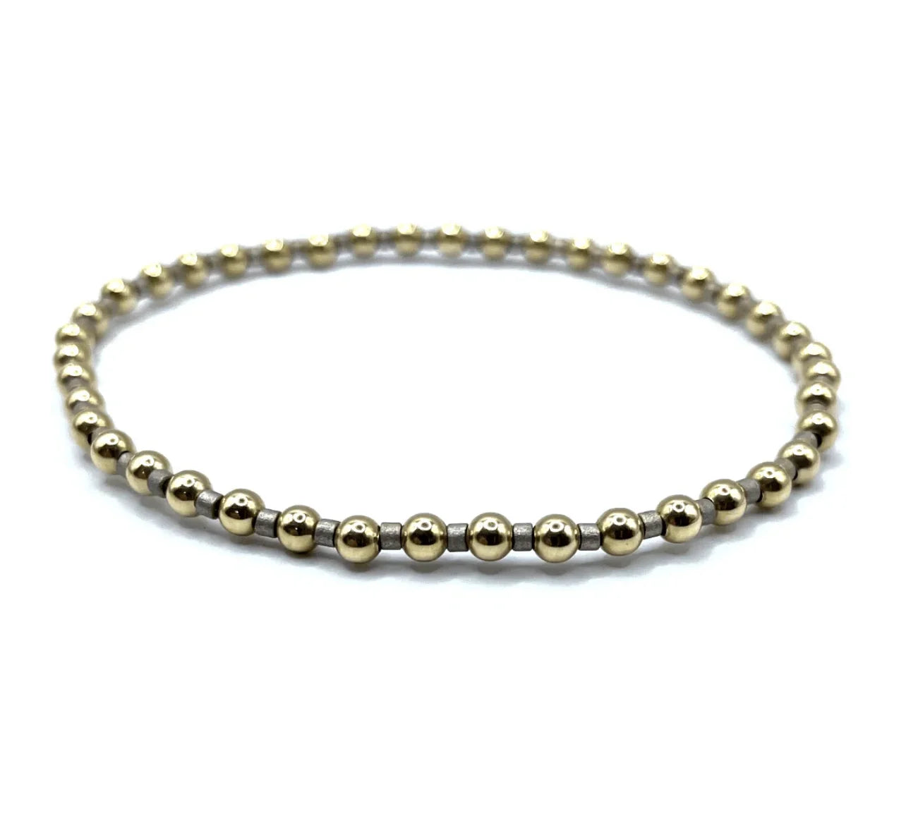 Delicate pewter glass seed beads dotted with 3mm gold-filled beads. Waterproof and perfect for stacking.