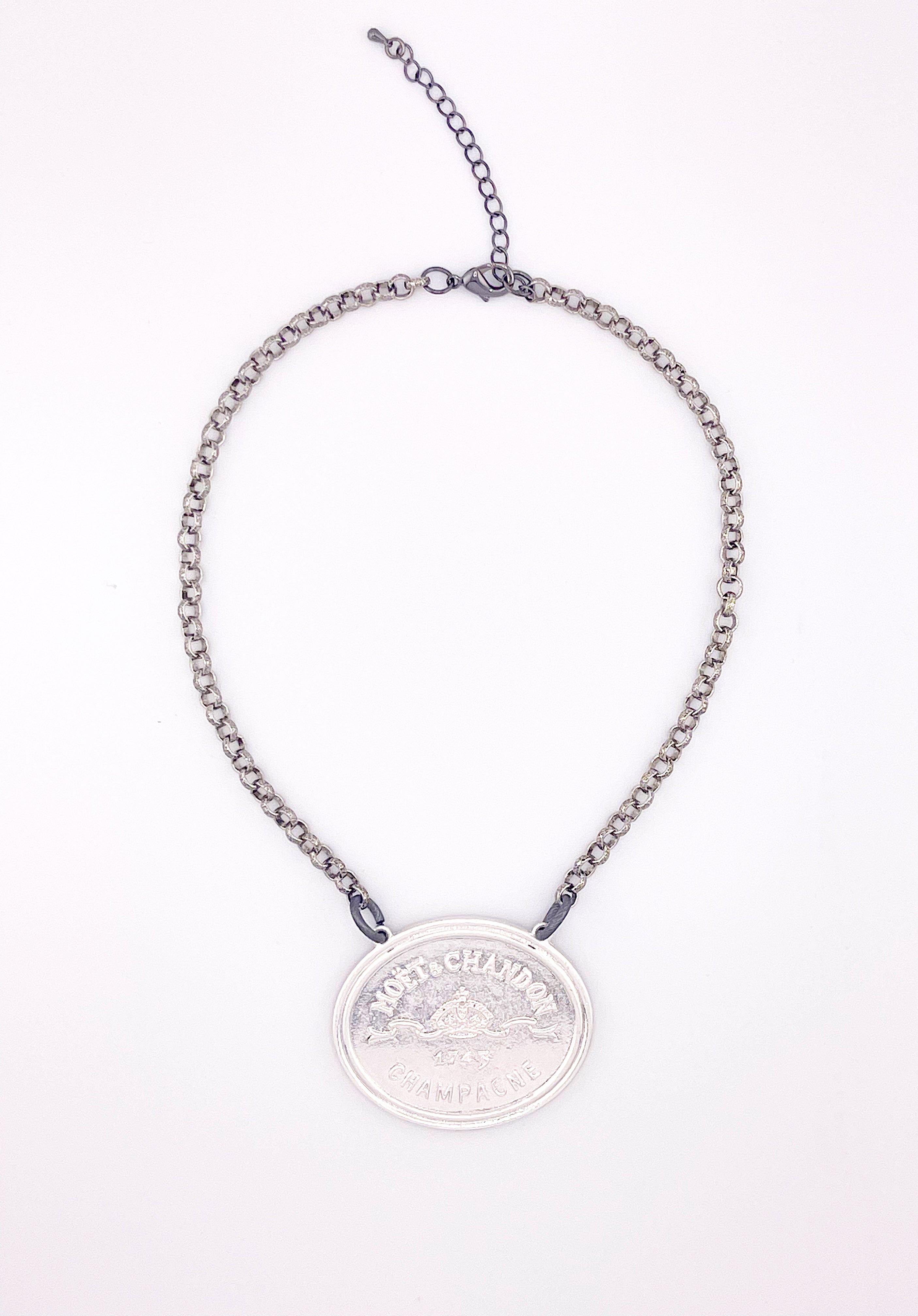 Where vintage charm meets modern edge — The Bellamy Necklace captures the essence of timeless sophistication. A finely etched champagne medallion rests at the center of an antique-finish stainless steel rolo chain, creating a piece that feels both classic and confidently bold. Its silvery glow and textured links make it the perfect statement for day or night.