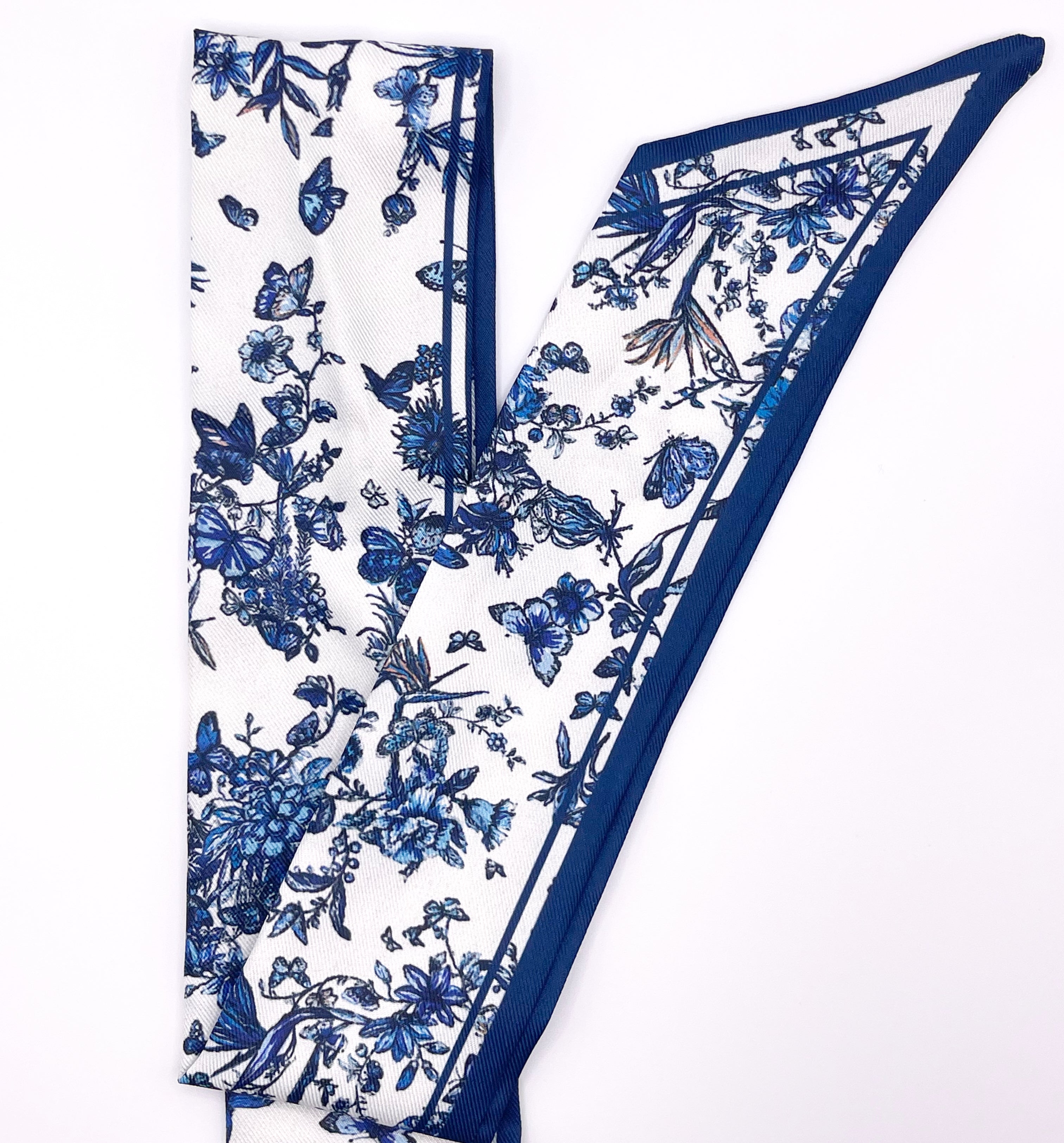 Knot it around your neck for a romantic touch, loop it through charm rings for a customizable look, or weave it into your hair for an ethereal accent. The Blue Butterfly Scarf adds graceful movement and refined charm to any outfit.