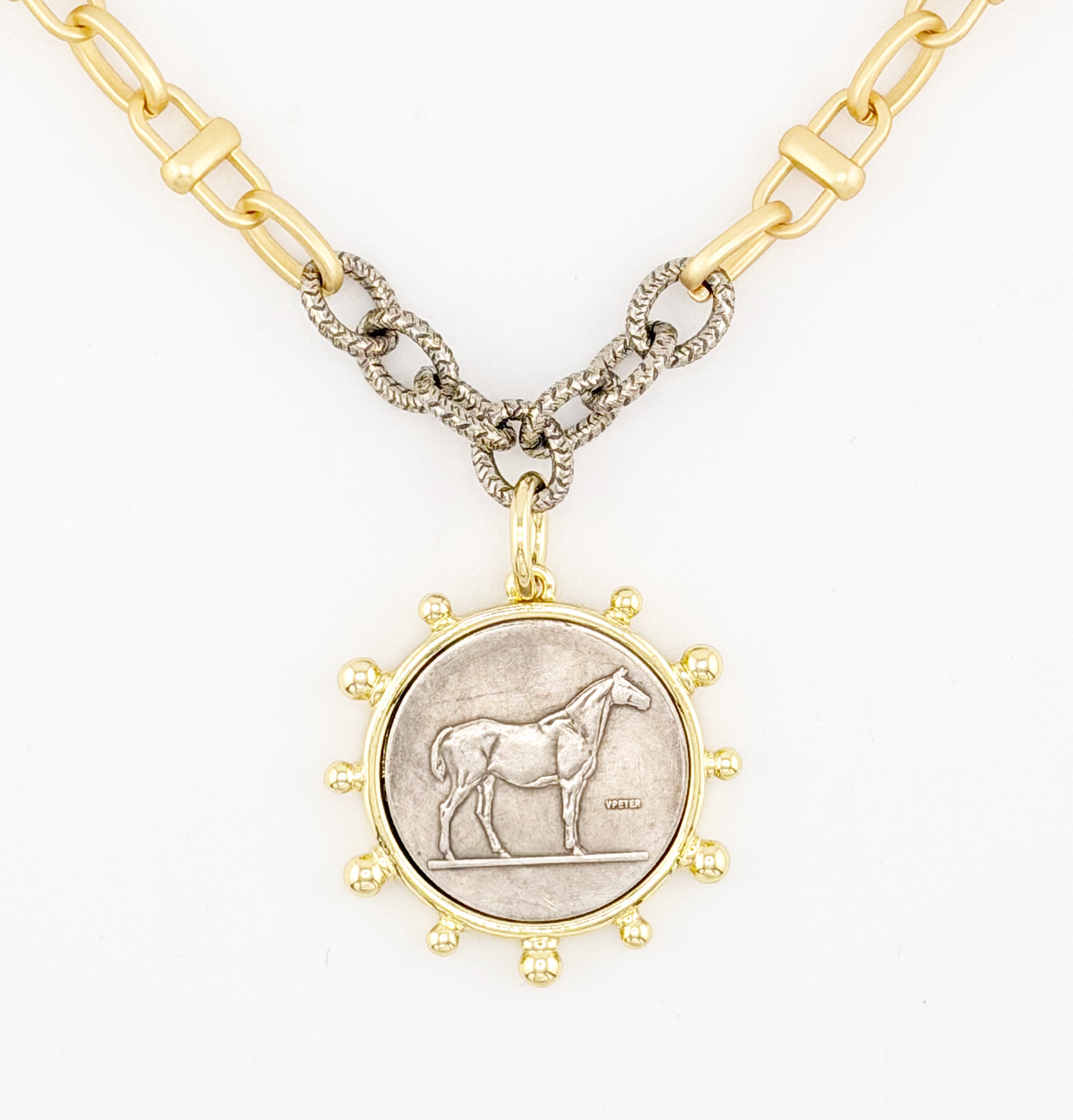 Refined and boldly timeless, The Belmont Estate Necklace pairs a matte gold link chain with striking silver accents and a vintage-inspired horse coin pendant. The mixed-metal design gives it depth and character, while the equestrian motif adds heritage charm with modern sophistication.