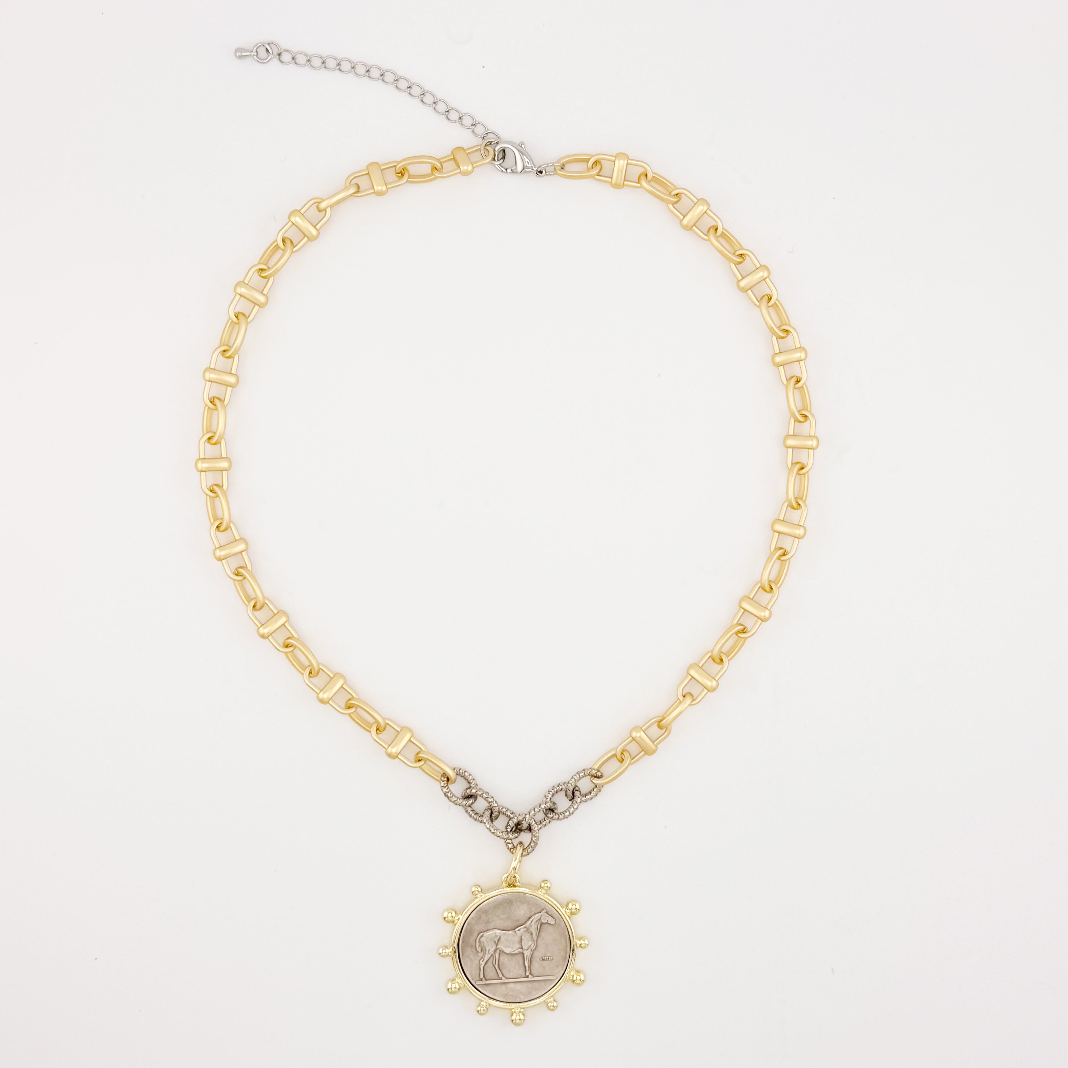 This necklace makes a confident statement without feeling overdone. The substantial 20-inch matte gold chain frames the neckline beautifully, while the silver horse coin set in a gold bezel creates a rich contrast that instantly elevates any look.