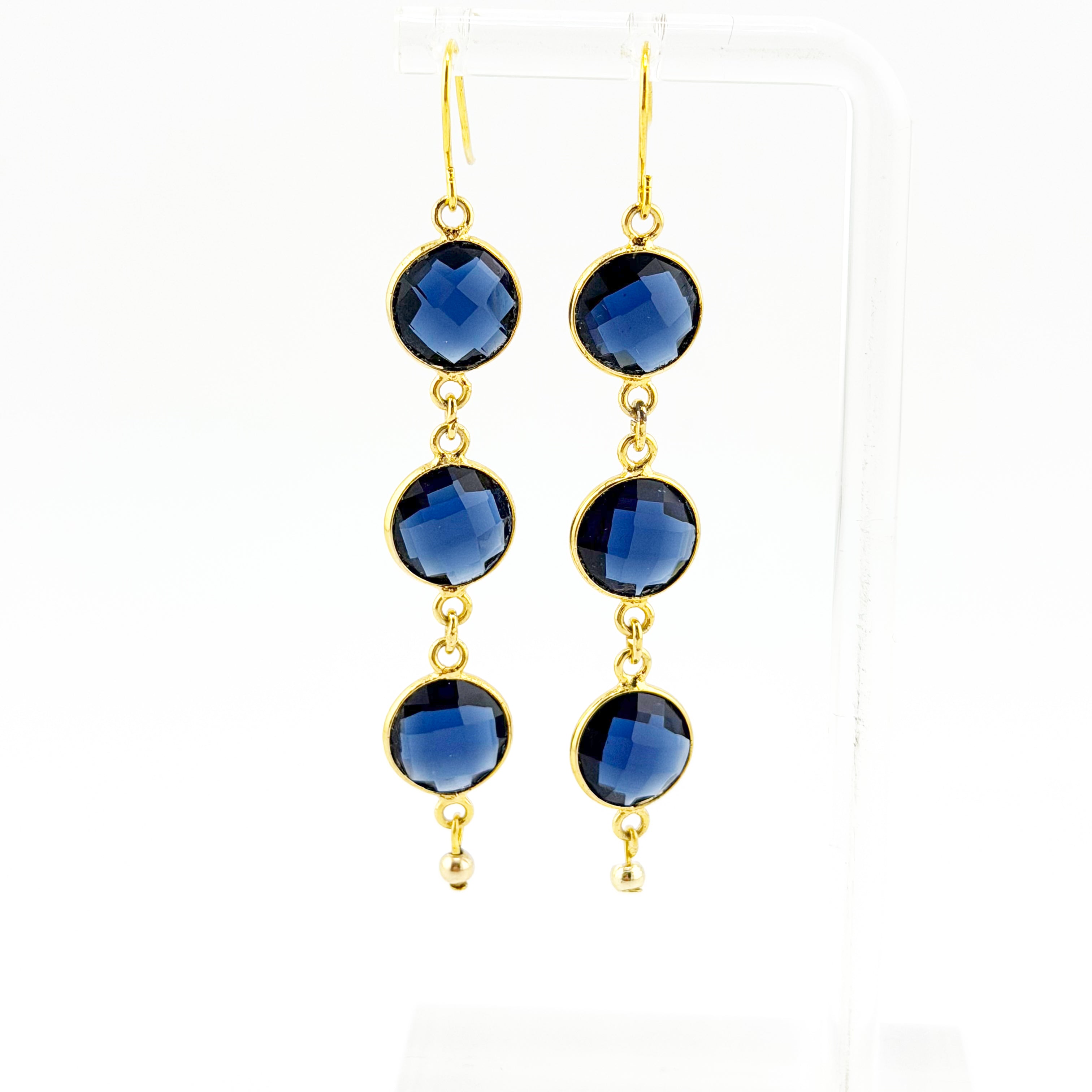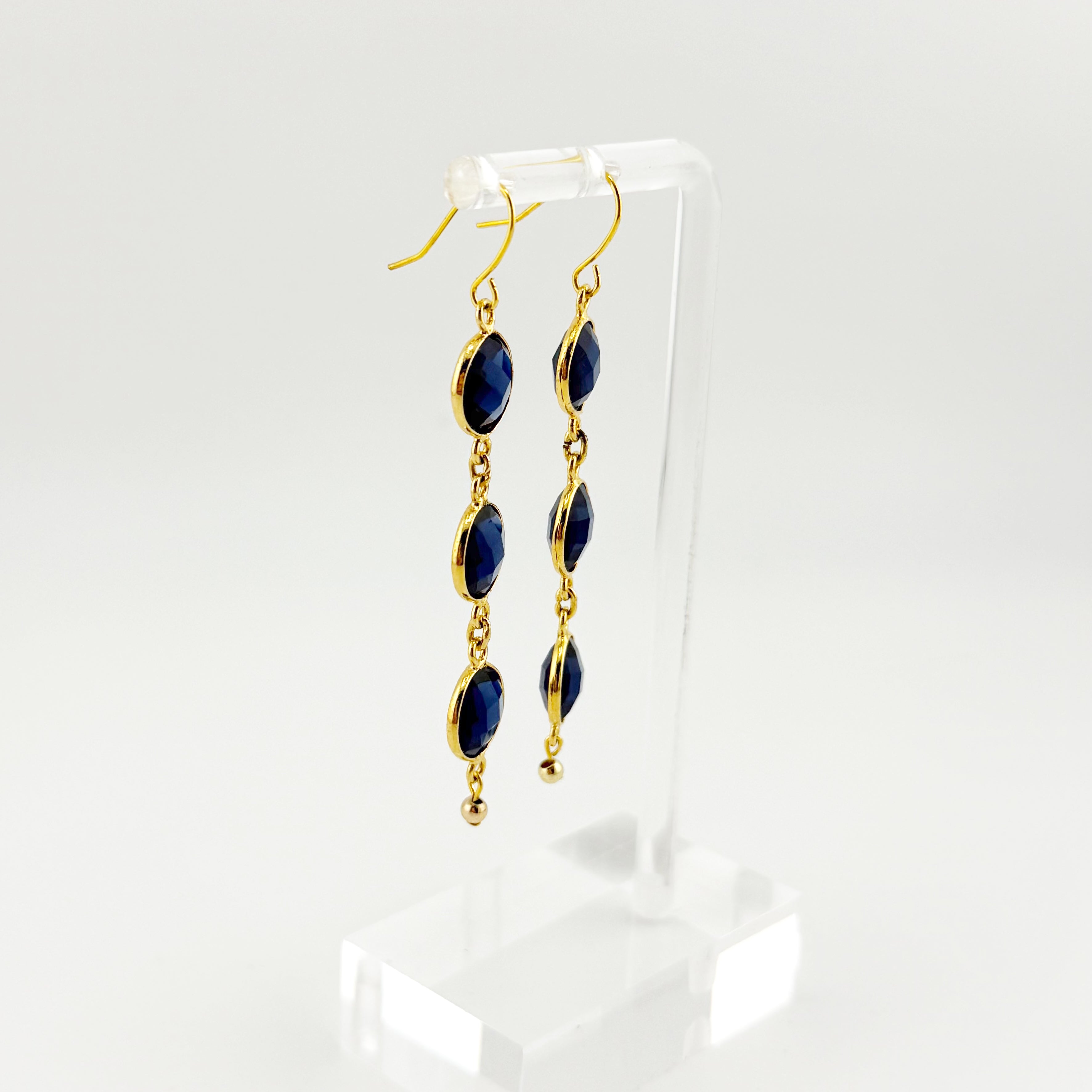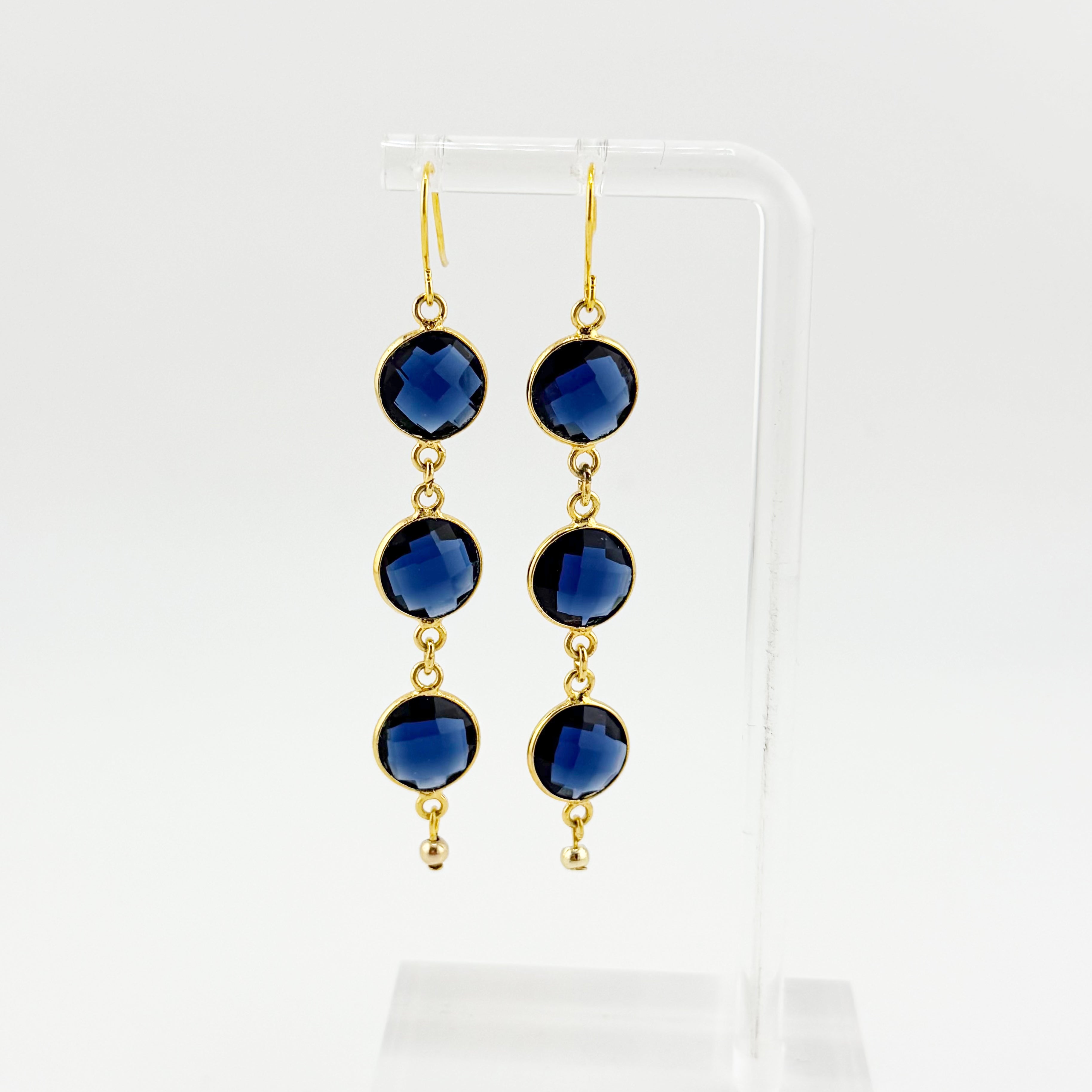 The Maren Drops deliver striking elegance with a cascade of three faceted navy onyx stones framed in polished gold. Their long, graceful silhouette adds movement and richness to any look, while the deep blue tones bring a touch of sophistication. Lightweight yet eye-catching, these earrings are perfect for day-to-night styling.