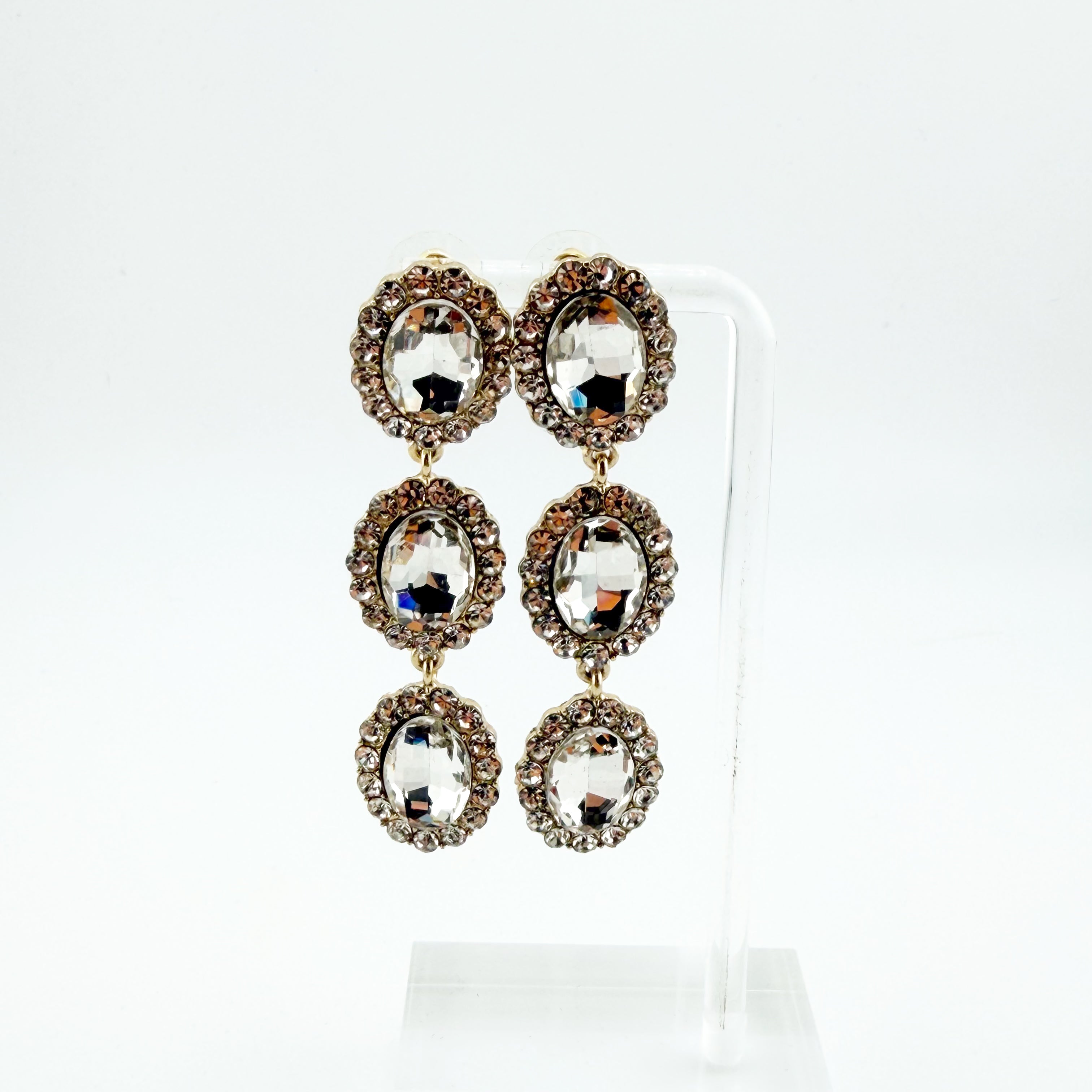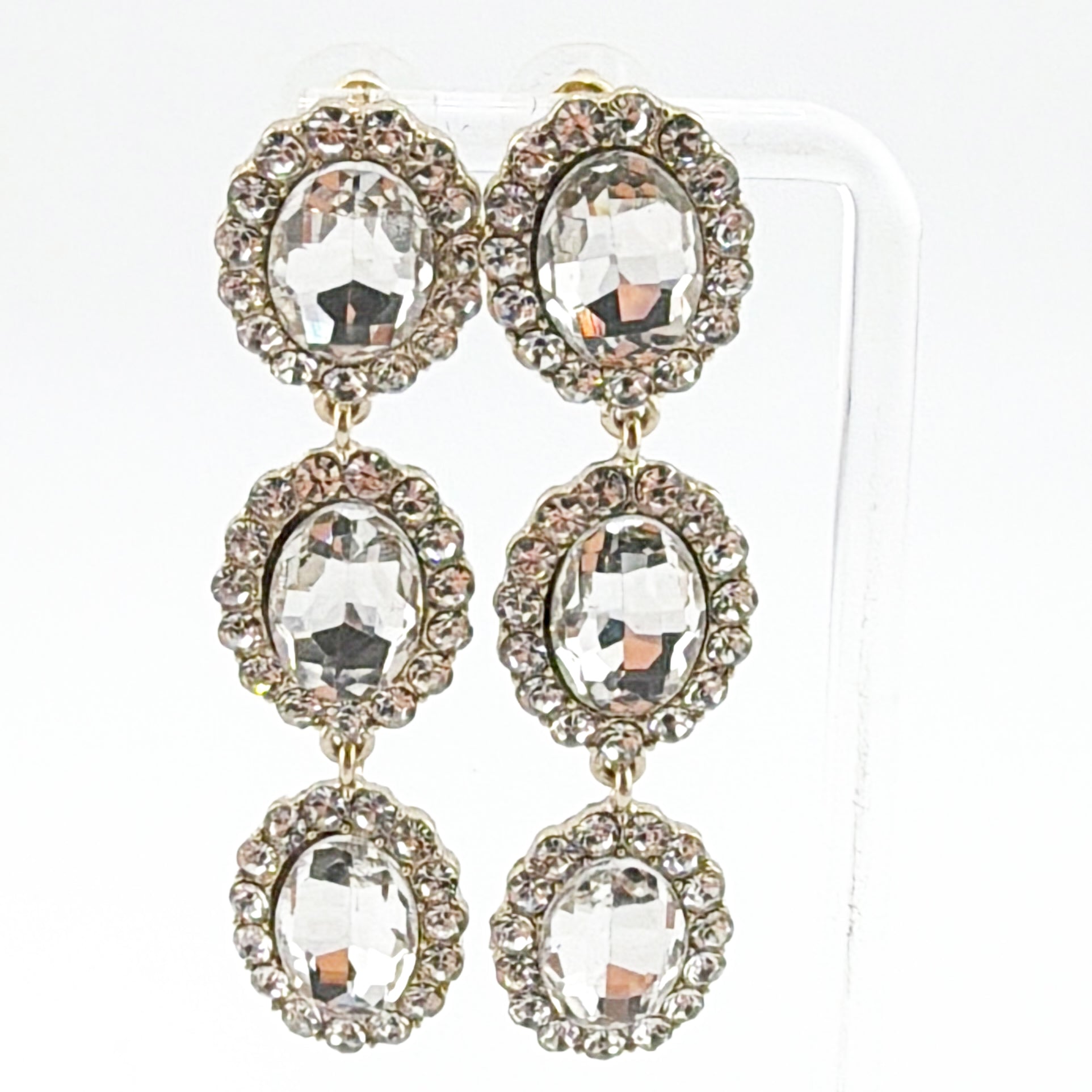 The Monroe Drops bring bold, glamorous sparkle in a classic, timeless silhouette. Featuring three oval brilliant-cut crystals framed in shimmering halos, these statement earrings deliver red-carpet elegance with every movement. At 3 inches long, they offer dramatic length without feeling heavy — perfect for special moments when you want all eyes on you.